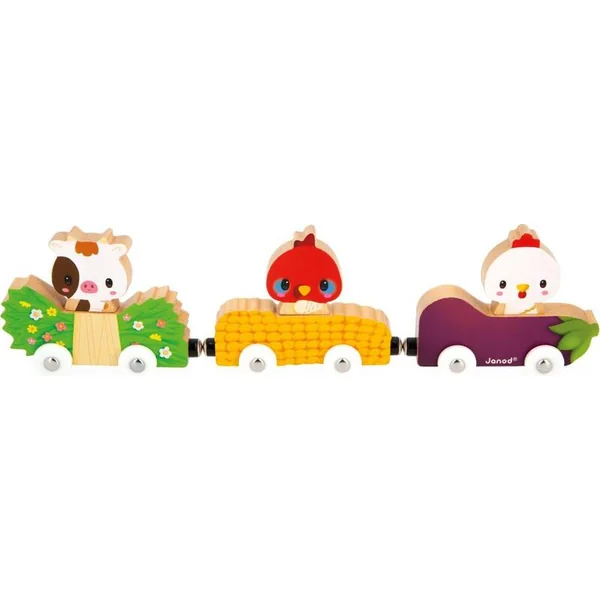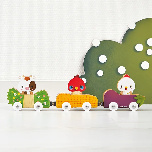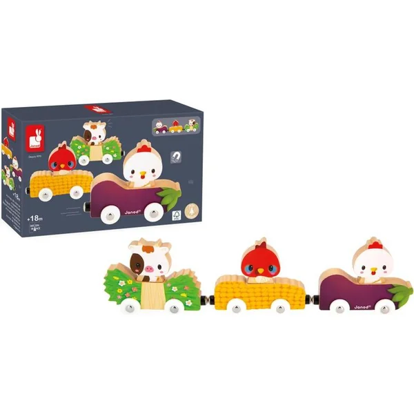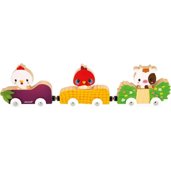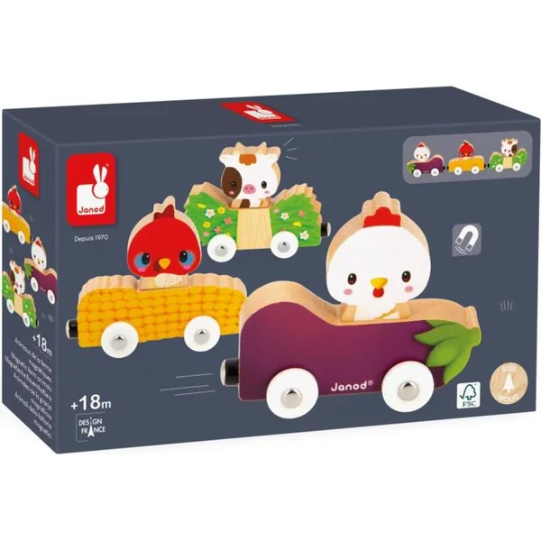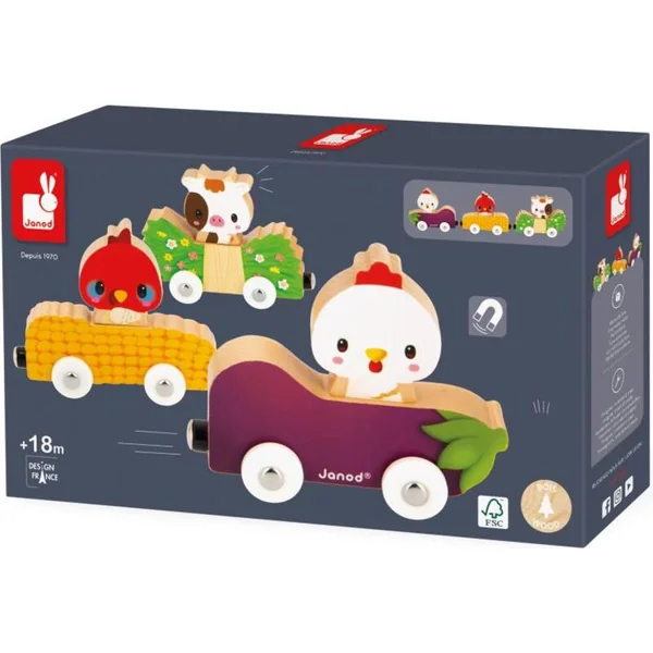 Les animaux vivant dans les prairies et dans l’étable adorent les courses à la ferme ! Ce jouet magnétique se compose de 3 voitures (aubergine, maïs et fleurs des champs) et de 3 figurines en bois (poule, dinde et vache).