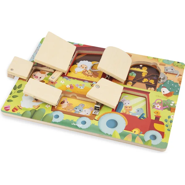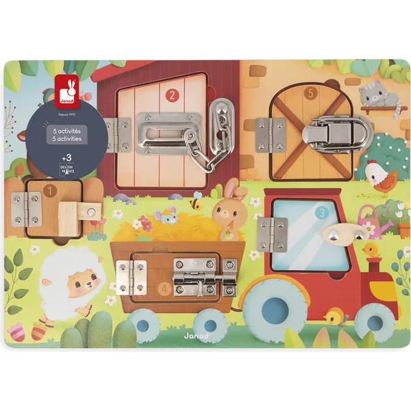 Toc, toc, toc ! Qui se cache derrière la porte de la grange ? Ce joli tableau à loquet illustre la vie quotidienne des animaux de la ferme et de leurs petits. Il a 5 portes avec différents systèmes d’ouverture : crochet en bois, loquet en bois, serrure à chaîne, loquet à bascule et serrure à bouton. Chaque porte a un numéro différent et une surprise !