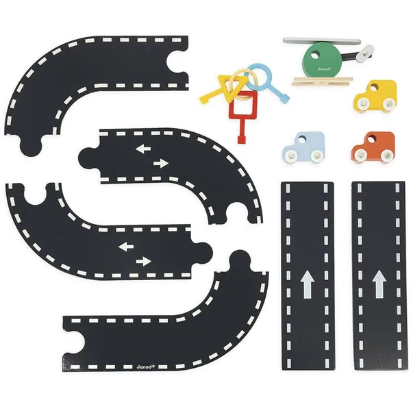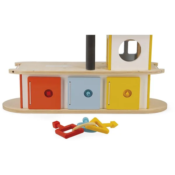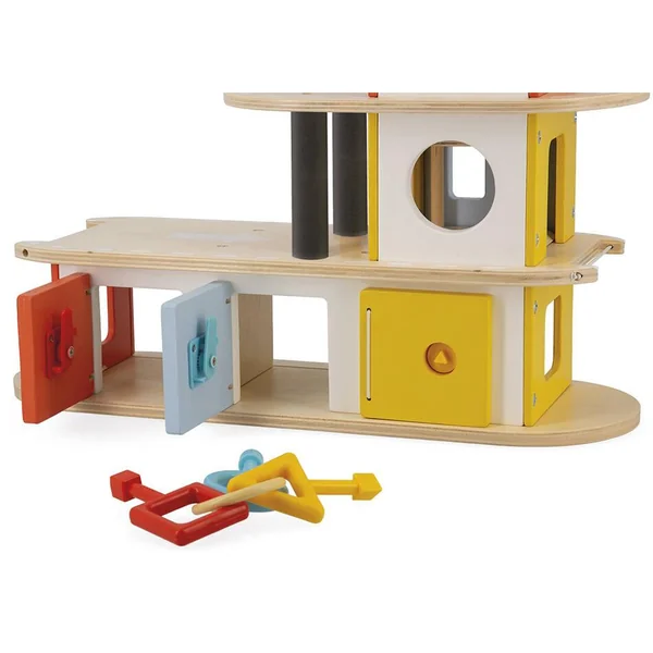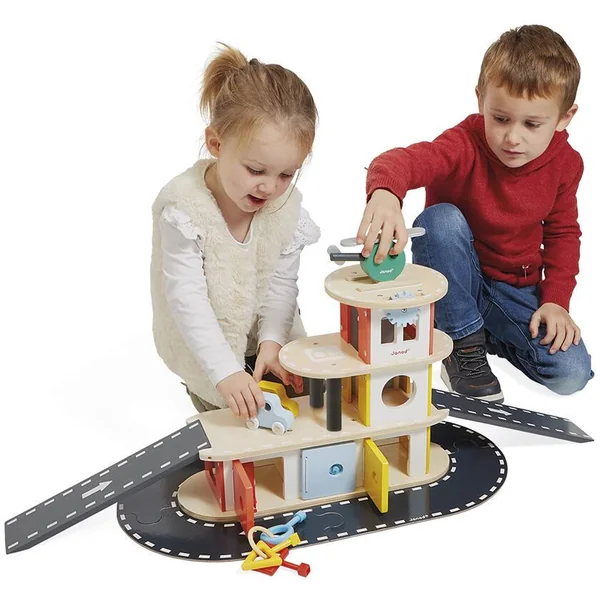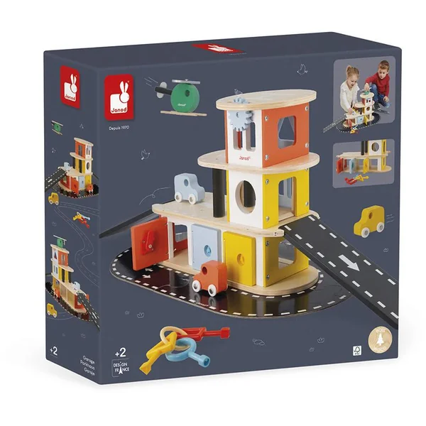 Ce garage est équipé d’un ascenseur mécanique, d’une fonction « boite à clés » au premier étage avec 3 portes à ouvrir avec 3 serrures géométriques différents (rond, triangle et carré) et 3 clés en plastique ainsi que 3 voiture et un hélicoptère en bois pour jouer avec son garage. Dimensions du garage : 92 x 32 x 30,5 cm – Matière : bois certifié FSC –