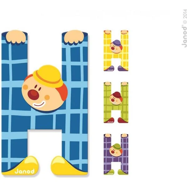 Lettre en bois H Janod avec autocollant, belle décoration pour une porte ou un mur. Choisissez la lettre H Clown parmi 4 couleurs : jaune, bleu, vert, violet et indiquez votre choix dans la commande. Le prix indiqué est pour 1 pièce.