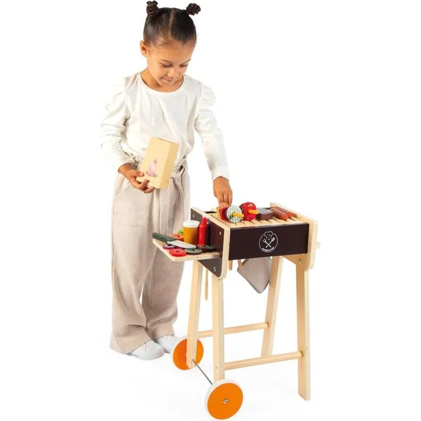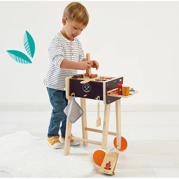 Ressentez-vous ce délicieux parfum de saucisses grillées ? Avec ce magnifique jouet en bois pour le barbecue, le repas sera certainement festif, c’est très réaliste ! Les enfants, mettez vos tabliers, vous êtes les chefs cuisiniers ! Les soirées barbecue, événements incontournables de l’été, pourront désormais avoir lieu toute l’année sous la direction de nos petits cuisiniers qui se feront un plaisir de cuisiner pour leurs parents. Avec ce barbecue mobile sur pieds, les enfants à partir de 3 ans peuvent s’amuser à cuisiner pour leurs amis.