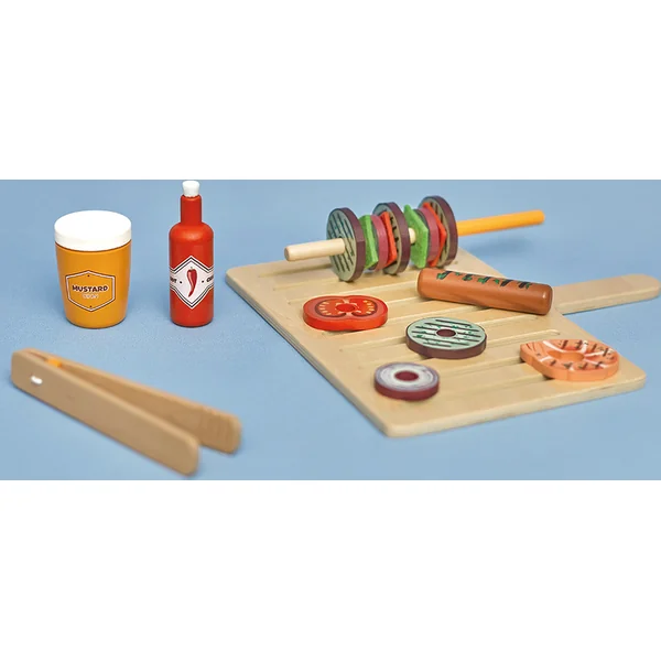 • 35 ingrédients alimentaires (2 saucisses, 1 steak, 4 tranches de tomate, 14 tranches de poivron, 4 crevettes, 4 tranches d’aubergine, 4 tranches d’oignon, 1 pot de sauce piquante et 1 pot de moutarde). Bien sûr, les outils de base nécessaires pour un barbecue parfait : 2 brochettes, 1 couteau, 1 spatule, 1 pince et 1 manique en tissu pour saisir tout ce dont vous avez besoin sans vous brûler !