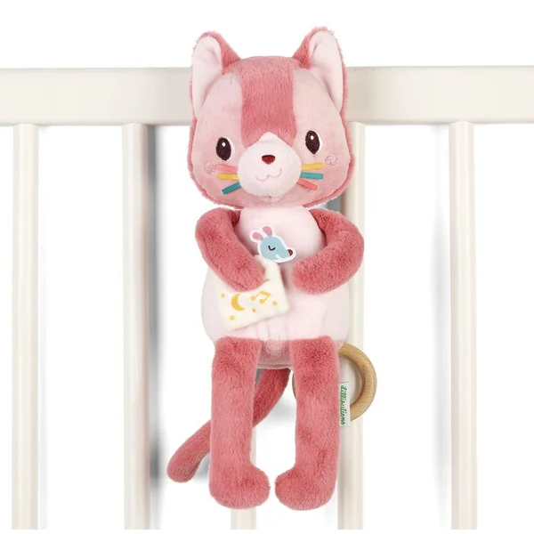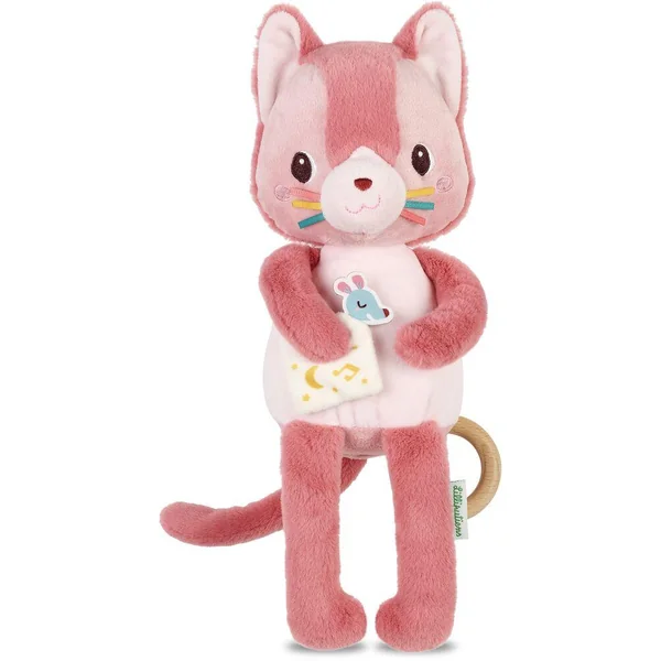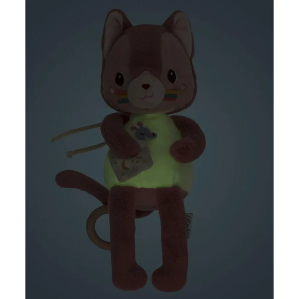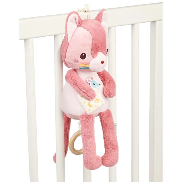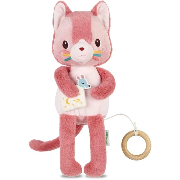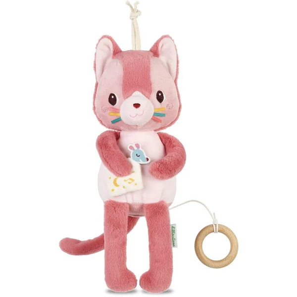 Une jolie mélodie retentit grâce à la peluche musicale Jeanne le chat, qui berce petits et grands sur la mélodie de ‘Those were the days’ de Mary Hopkin. Ce jouet sonore tout doux est idéal pour apaiser bébé et l’éveiller aux sons, dès la naissance. Pour diffuser la musique, il suffit de tirer sur l’anneau en bois. Pratique, vous pouvez suspendre la peluche au parc ou au lit grâce à une attache située à l’arrière. Une fois la lumière éteinte, Jeanne veillera sur votre tout-petit en brillant dans la nuit pour rassurer bébé tout en le bercant avec sa douce musique.
