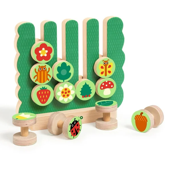 Un jeu de reproduction de combinaisons colorées et illustrées. L’enfant choisit une carte modèle, sélectionne les bonnes pièces en bois et les glisse dans le support pour reproduire parfaitement la séquence de la carte. Mais attention, ce n’est pas si facile, car les pièces ont des images légèrement différentes au recto et au verso.