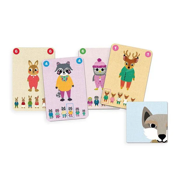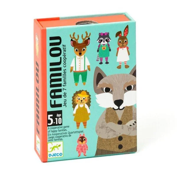 Le Jeu de 7 familles Familou de Djeco est un jeu de cartes coopératif de 2 à 5 joueurs à partir de 5 ans où tous les joueurs tentent ensemble de reconstituer les 7 familles avant l’arrivée du loup !