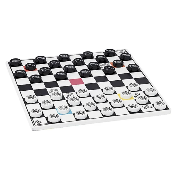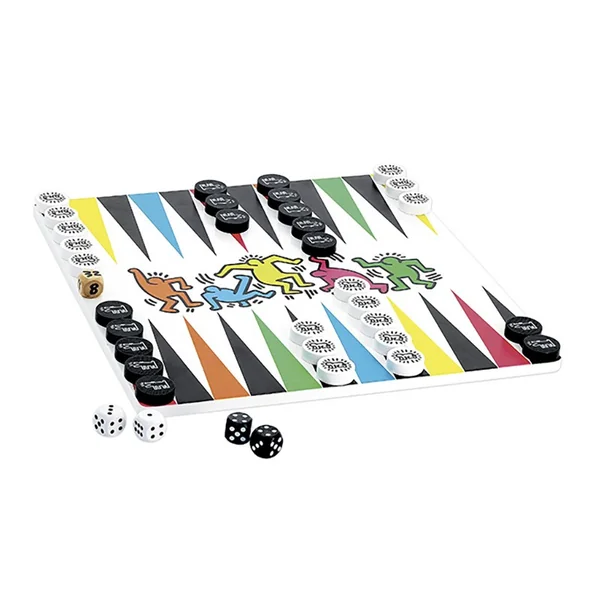 Ce coffret comprend 2 jeux, le jeu de dames et le jeu de backgammon, reprenant les dessins originaux de l’artiste Keith Haring.