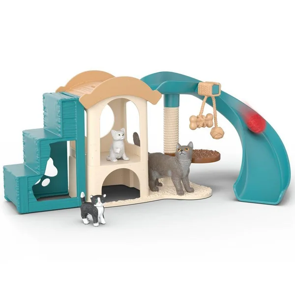 Et hop, c’est parti ! Les deux chatons dévalent le toboggan comme deux tornades, sautent ensuite sur l’arbre à chat, avant de disparaitre d’un bond dans la maisonnette. Comme les petits sont déjà habiles ! La maman chat garde un ½il sur tout ce qui se passe et est particulièrement fière de ses rejetons. Mais au bout d’un certain temps, l’heure est venue de faire une pause. Ensemble, ils s’installent confortablement dans la maisonnette. Plus tard, les petits pourront à nouveau jouer. Peut-être iront-ils sur la balançoire ? Pendant ce temps, leur mère s’amusera sur l’arbre à chat.