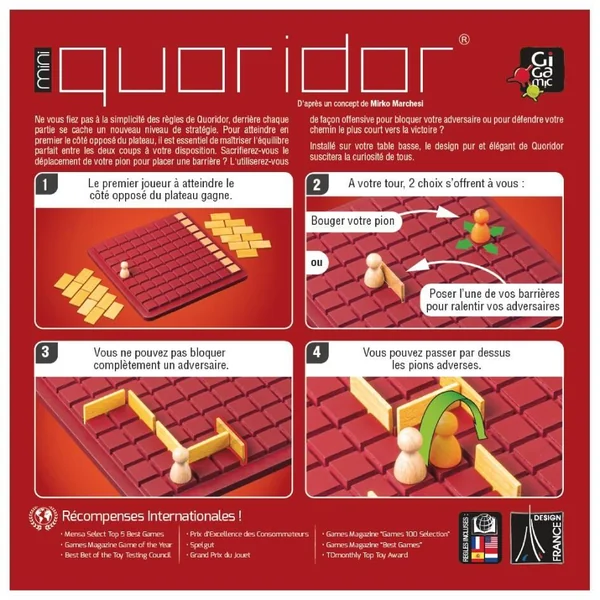 Le fameux Quoridor en format mini ! Votre but : atteindre le premier la ligne opposée. Votre problème : l’adversaire pose des barrières pour vous ralentir ! Rassurez-vous : il doit vous laisser au moins un passage libre. Mais qui aura le chemin le plus court ? Un jeu captivant et vraiment drôle, accessible à tous. Les joueurs se partagent les barrières et chacun pose son pion au centre de sa ligne de départ. A tour de rôle, chacun déplace son pion d’une case, ou pose une barrière afin de ralentir l’adversaire. Les pions doivent contourner les barrières, qui créent un labyrinthe dont il faut sortir très vite, car le premier qui atteint la ligne opposée à sa ligne de départ a gagné !