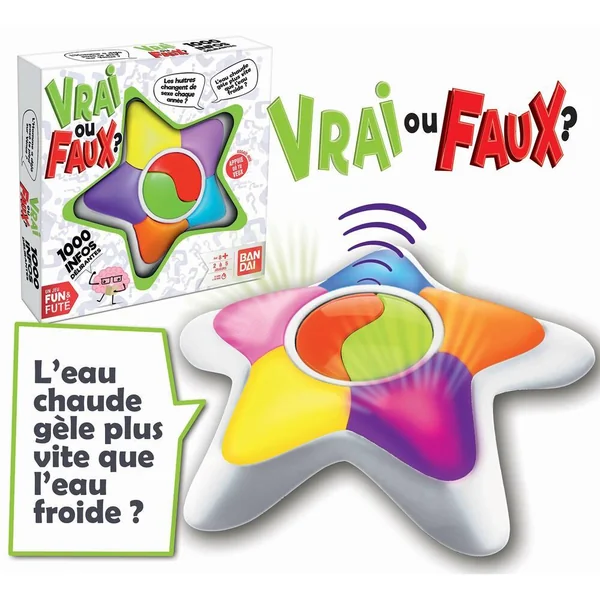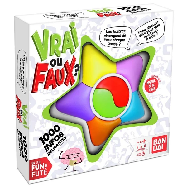 1000 déclarations folles… Arriverez-vous à discerner le vrai du faux ? Le maître du jeu dit une déclaration. À vous de deviner si c’est vrai ou faux! Si vous pensez connaître la réponse, soyez le premier à frapper sur votre buzzer… Vous gagnez un point si vous avez raison… mais en perdez deux si vous vous trompez ! L’avantage est la variété de questions aussi bien pour les plus jeunes que les adultes. Un jeu vraiment ludique ! De 2 à 5 joueurs.