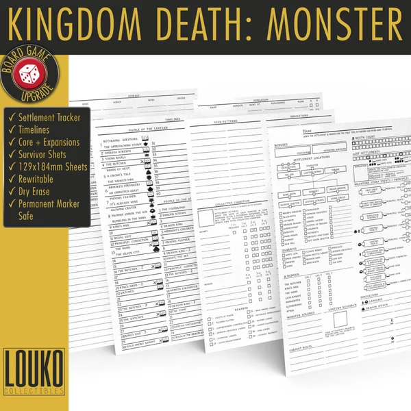 Un moyen simple de suivre votre campagne dans Kingdom Death: Monster avec des feuilles de sauvegarde réinscriptibles, à l’aide de marqueurs effaçables à sec permanents ou non.