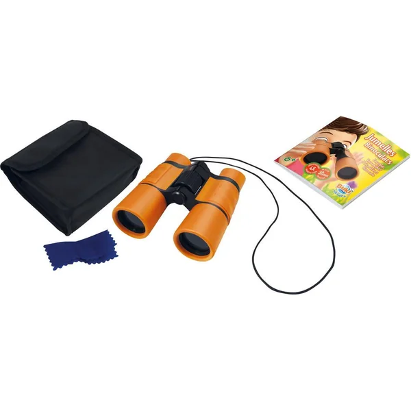 Cordon pour les mettre les jumelles autour du cou. Inclus : pochette de transport et lingette pour nettoyer les objectifs. Notice illustrée en couleurs.