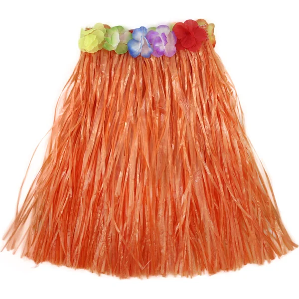 - La jupe, longue de 45 cm, est fabriquée à partir de fines bandes en plastique de couleur orange et ornée de pétales colorés. Génial !