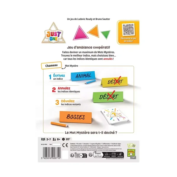 Just One est un party game coopératif dans lequel les joueurs jouent tous ensemble pour découvrir le plus de mots mystères. Pour obtenir le score le plus élevé, vous devrez trouver le meilleur indice pour aider votre équipier. Mais attention, vous devrez impérativement être original, car tous les indices identiques seront annulés ! Les joueurs doivent faire deviner un mot Mystère à l’un des joueurs en écrivant chacun, secrètement, un indice sur son chevalet. Sans concertation, les joueurs réfléchissent au meilleur indice à faire deviner au joueur actif. Il faudra alors veiller à ne pas choisir un mot trop banal ou trop évident, car seuls les indices uniques seront conservés pour aider le joueur à découvrir le mot Mystère. À la fin de la partie, calculez votre score en fonction du nombre de mots Mystère trouvés.