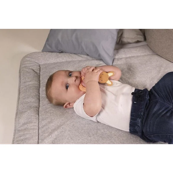Un anneau de dentition en silicone avec des picots pour masser les gencives douloureuses, avec une petite tête en bois de lapin, est l’outil idéal pour soulager les gencives douloureuses de votre enfant.