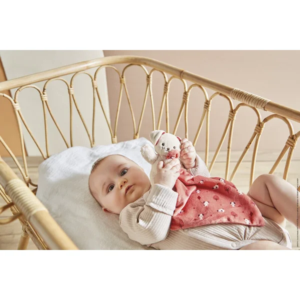 Ce doudou est fabriqué à partir de matériaux extrêmement doux, agréables au toucher et respectueux de la peau délicate des bébés. Le chien tient dans ses pattes une petite couverture carrée, idéale pour être saisie par de petites mains, câlinée ou mâchouillée. Un élément de design marquant est ses longues oreilles pendantes et la broderie bleue sur sa patte, qui est une caractéristique typique de la collection. Le produit est écologiquement responsable, fabriqué à partir de 100 % de polyester recyclé.