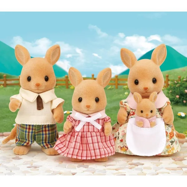 La famille kangourou est composée de 4 personnages : la maman, le papa, le fils et la fille. Ils sont tous articulés. Ils sont tous habillés avec soin. Leurs vêtements peuvent être enlevés et remis à loisir.Dans la famille Kangourou, le fils est encore bébé. Il est installé dans la poche de sa maman.