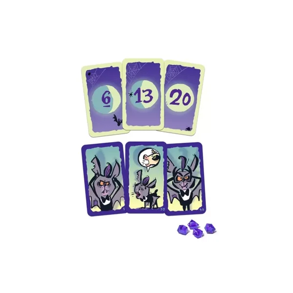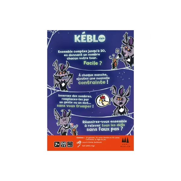 Keblo : Tous ensemble, les joueurs comptent de 1 à 20, en donnant chacun un nombre à leur tour. À chaque manche, Fréd la chauve-souris vous indique une nouvelle contrainte ! Remplacez un nombre par un autre, par un geste, un bruit ou encore un mot : réussirez-vous à relever tous ses défis ?