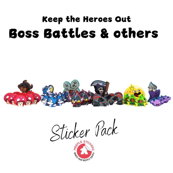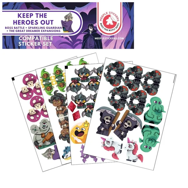Aujourd’hui, nous vous apportons un fantastique nouveau pack d’autocollants contenant des stickers pour trois extensions du célèbre jeu Keep The Heroes Out : Boss Battles, Sparkling Guardian et The Great Dreamer. Vous pourrez jouer avec une grande variété de créatures et donner vie aux meeples en bois avec nos autocollants uniques.