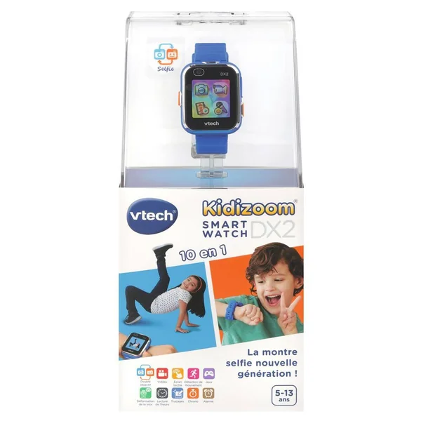 Cette montre a de nombreuses fonctionnalités destinées aux enfants de 5 ans et plus. Il y a l’écran tactile en couleur, le double affichage de l’heure soit digital, soit analogique. Elle possède un appareil photo et une caméra pour faire des vidéos. Votre enfant peut directement retoucher des photos sur l’écran tactile (cadres, effets de trucages, ajout de filtres de couleur, des tampons etc.). Il y a aussi la fonction réveil/alarme et divers jeux pour apprendre à lire l’heure. Cette montre dispose d’un dictaphone pour enregistrer et déformer la voix, un détecteur de visage pour les effets drôles, un chronomètre et un sablier. 8 activités et jeux sont inclus avec 3 défis sport pour s’amuser en dansant, sautant ou en courant. Vos enfants peuvent aussi se connecter avec la Kidizoom smartwatch dx2 bleue pour télécharger de nouveaux contenus. - Comment votre enfant peut-il profiter de la montre ?