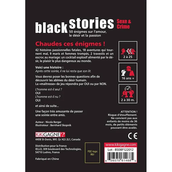 Les Black Stories sont des énigmes sinistres qui pousseront les joueurs à réfléchir différemment pour les résoudre. Reconstituez chaque situation en posant des questions simples au maître de l’énigme, en étudiant les réponses minutieusement et en laissant votre imagination vous guider. Un jeu terrifiant idéal pour animer une soirée entre amis !