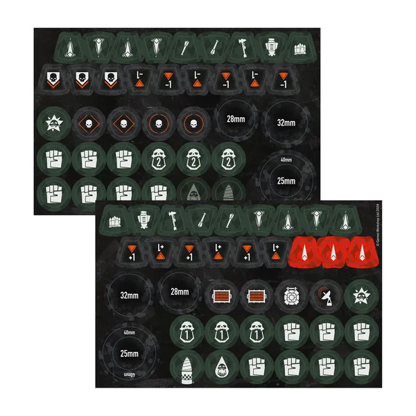 Dans la boîte, vous trouverez également une planche de 38 pions double face de la Bande de Bouzilleurs, afin de garder facilement un œil sur votre équipement et les effets en cours dans le feu de la bataille.
