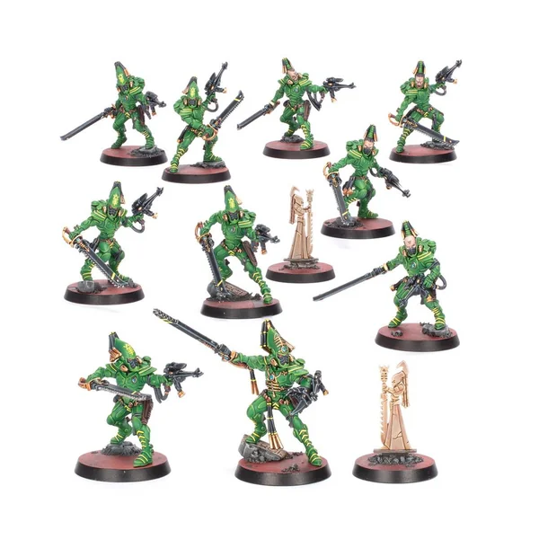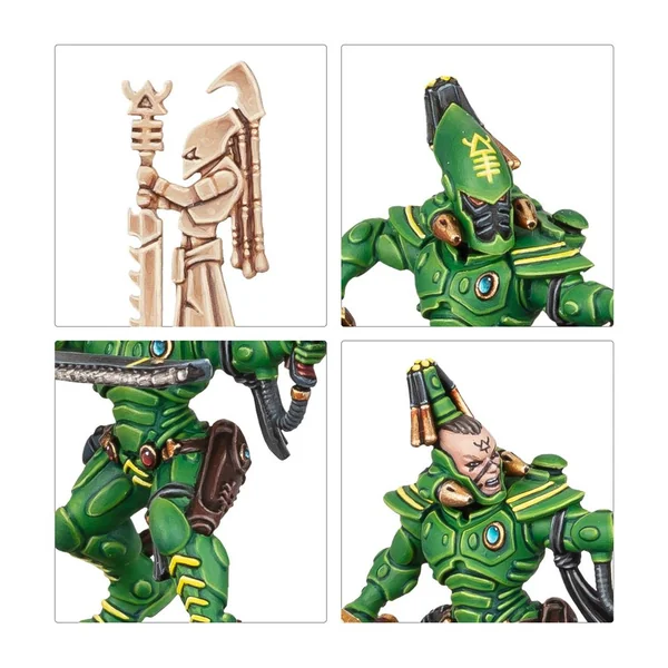 Ce kit en plastique permet d’assembler une escouade de 10 Guerriers Aspect Scorpions Foudroyants. Ces figurines peuvent être utilisées en tant qu’agents dans les parties de Kill Team ou être incorporées au sein des armées des Aeldari dans les parties de Warhammer 40,000. Chaque figurine dispose d’une option de tête nue ou casquée, et une figurine sur cinq peut être assemblée en tant qu’Exarque, avec le choix entre une lame mordante, deux épées tronçonneuses, ou une pince de Scorpion et une épée tronçonneuse. Vous trouverez également deux statues de sanctuaire dans ce kit.