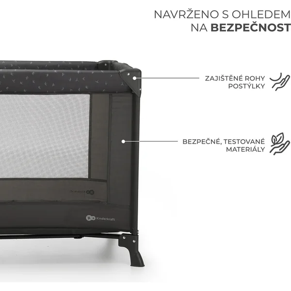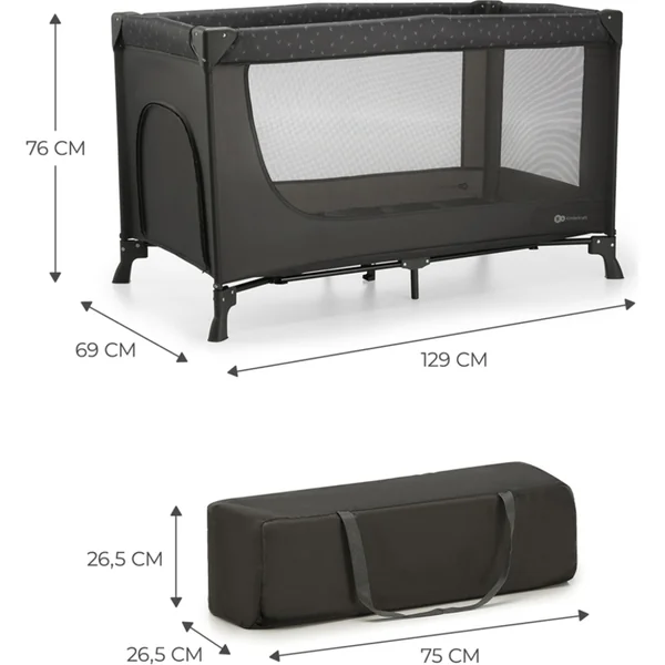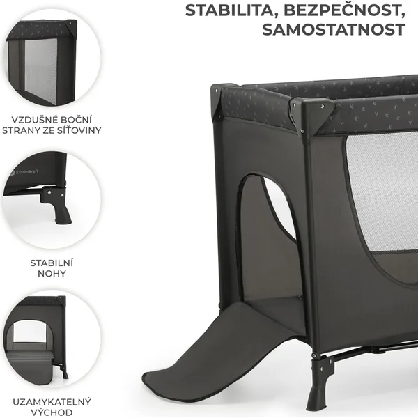 Les côtés en maille du lit JOY LIGHT vous permettent de garder un œil sur votre enfant, tandis que la sortie pratique à fermeture éclair permet à un enfant qui rampe de quitter librement le lit quand il le souhaite.