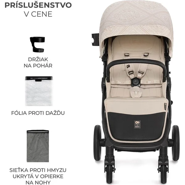La poussette est vendue avec un filet anti-insectes rétractable, qui peut être rangé dans le repose-pieds, et un porte-gobelet. MITZY a tout ce dont vous avez besoin pour des promenades et des vacances.