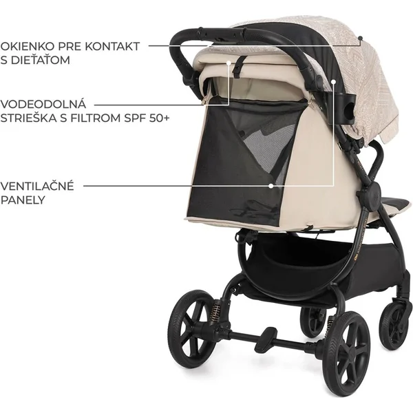 MITZY protégera votre enfant pendant la promenade – le grand canopy imperméable a un filtre UPF50+, qui protège encore plus votre petit des rayons UV. Il dispose d’un panneau de ventilation pour aérer pendant les chaleurs et d’une fenêtre pour le contact avec l’enfant. Vent, pluie – rien de tout cela n’est un problème pour cette poussette.
