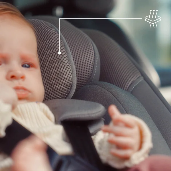 Le siège auto est équipé d’un cadre anti-rotation qui augmente la stabilité de la structure, réduit le jeu après installation et offre plus d’espace pour les jambes de l’enfant.