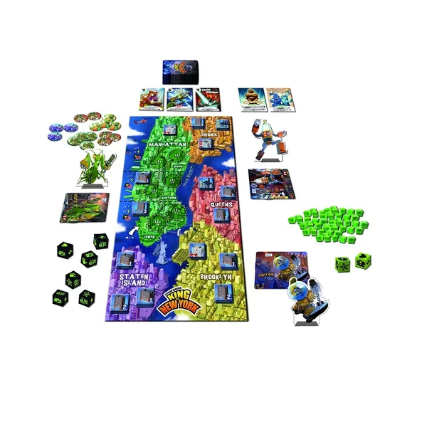King of New York reprend les principes de base de King of Tokyo tout en y ajoutant de nombreuses nouveautés. Lancez les dés, usez de tactique et faites la bonne combinaison. Piétiner tous les quartiers de la ville et détruire des immeubles vous fera gagner des points. Mais attention aux unités militaires qui font feu sur vous à chaque face « OUCH » lancée.
