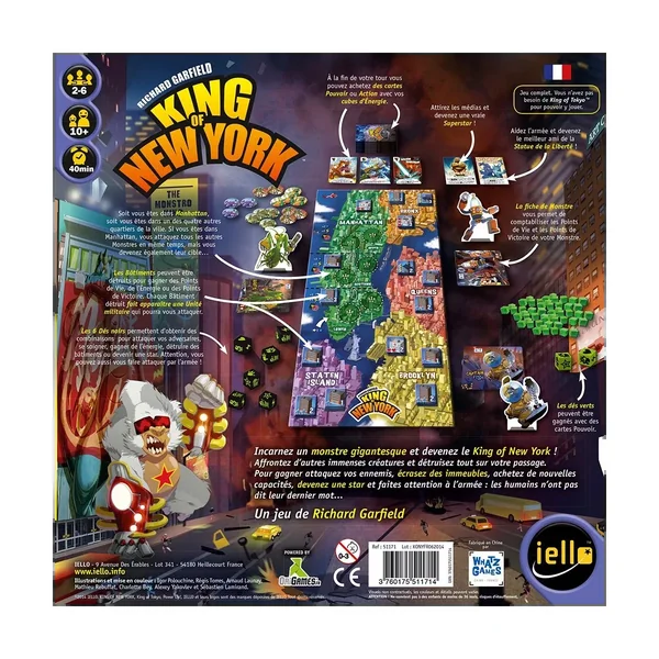 Une nouvelle ville, de nouveaux monstres et encore plus de bastons !!! Découvrez King of New York, la très attendue suite de King of Tokyo. Il se passe toujours quelque chose dans la ville qui ne dort jamais. Est-ce à cause des lumières ? De l’énergie qui habite ces rues ? Ou peut-être plutôt de ces monstres terrifiants qui se combattent sans pitié en dévastant tout sur leur passage.