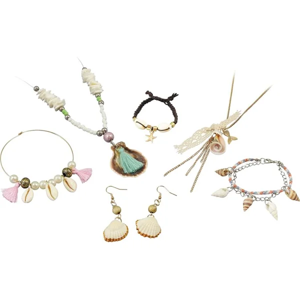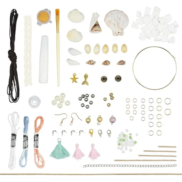 - Création de bijoux : Le kit comprend des accessoires pour fabriquer 6 bijoux, y compris des pendentifs, des coquillages, des chaînes, etc.