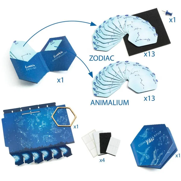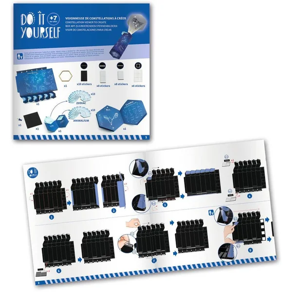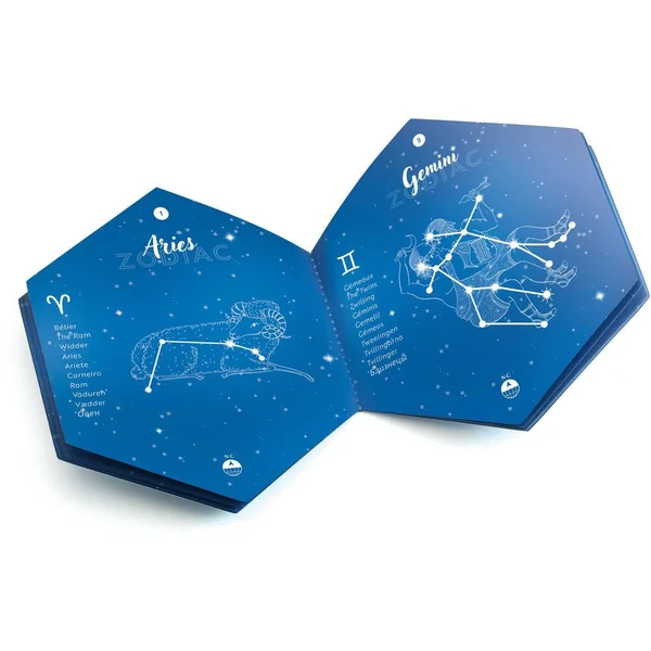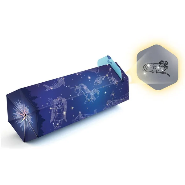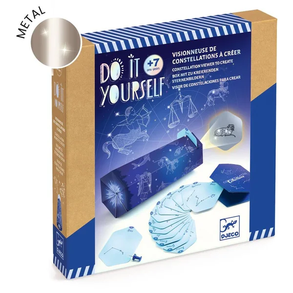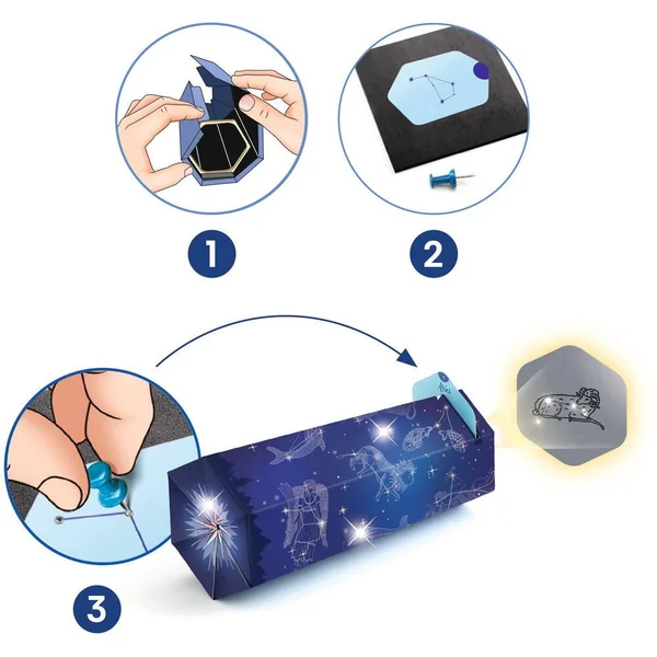 Un kit créatif pour fabriquer une visionneuse de constellations. L’enfant picote les étoiles sur les cartes pour recréer les motifs des 26 constellations sélectionnées (signes du Zodiaque et animaux), et découvre leur image à travers la visionneuse qu’il aura préalablement assemblée. L’apparition de l’illustration cachée de la constellation est absolument magique ! Un livret accompagne l’enfant pour l’aider à resituer la constellation dans le ciel étoilé. Un produit idéal pour éveiller les enfants à l’observation et à la beauté des étoiles…