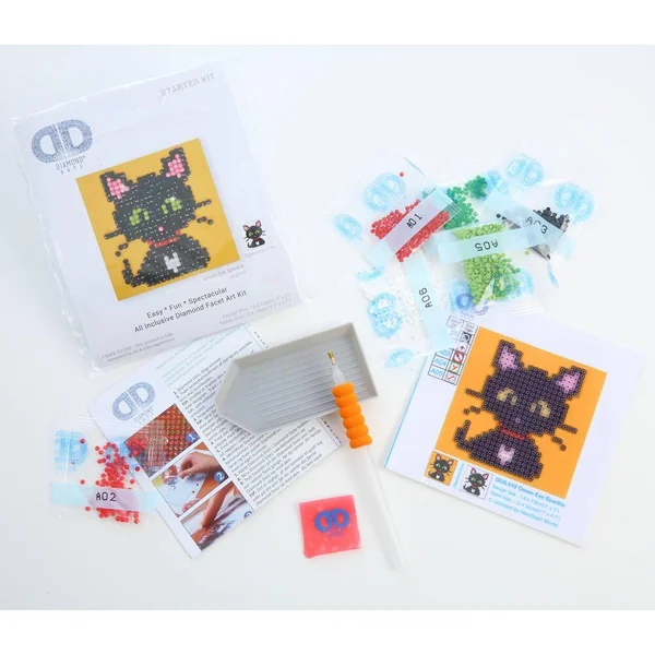 Kit débutant. Kit d’art broderie Diamant. Contient un modèle à réaliser, plus de 200 « diamants », 1 stylet, 1 bloc de cire, un plateau et instructions complètes. Principe du jeu : Facile, rapide et amusant à faire, saisis les diamants avec ton stylet et place les sur les symboles correspondants et réalise ainsi une création étincelante !