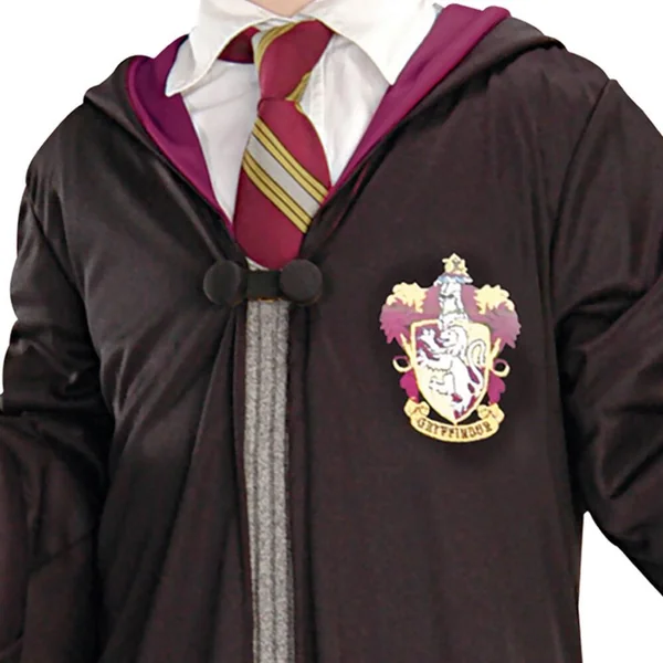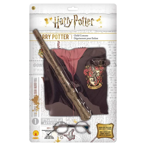 Kit comprenant un manteau avec capuche, une baguette magique, un fermoir et une paire de lunettes. (Chemise, cravate et chaussures non fournies). Taille Standard. 100 % polyester. Lavable à la main.