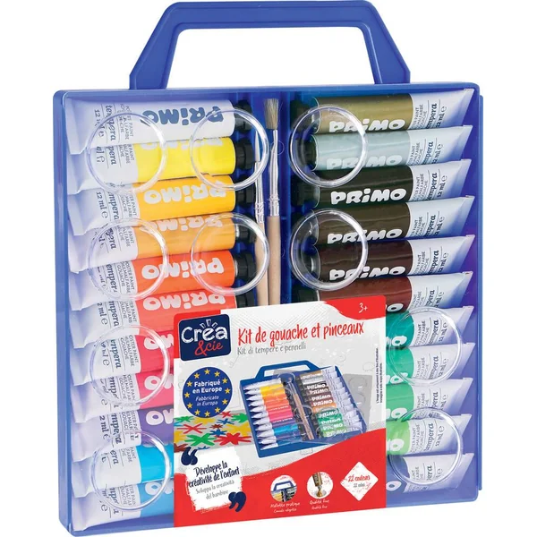 Contient : 1 mallette avec couvercle-palette, 22 tubes de peinture gouache de 12 ml et 2 pinceaux. Une gamme très vaste de couleurs, or et argent inclus. Tu vois les cercles sur le couvercle ? Ils sont conçus pour transformer cette mallette (couvercle) en une palette où tu peux diluer tes couleurs en dosant l’eau selon ton imagination. Génial ! Gouache en tube d’aluminium dans une mallette pratique avec un couvercle servant aussi de palette, 2 pinceaux et 22 couleurs. Cette peinture gouache très concentrée et de qualité fine est facile à étaler et très couvrante. Elle peut être diluée selon l’effet désiré. Lorsqu’elle sèche les couleurs restent très intenses et brillantes et elle peut être utilisée sur différentes surfaces : papier, papier cartonné, bois, textile, verre, métal, plastique et terre cuite. Pour augmenter l’effet couvrant mélanger 10 doses de couleur avec une dose de gouache blanche, pour obtenir des tonalités pastel délicates mélanger une dose de couleur avec 10 doses de gouache blanche. Gouache testée dermatologiquement et lavable en machine. Nettoyer les taches sur textiles en suivant les instructions. Développe la créativité de l’enfant. Pratique tout se range et se transporte dans la mallette. Dimensions de la mallette 18.9 x 22.2 x 2 cm.