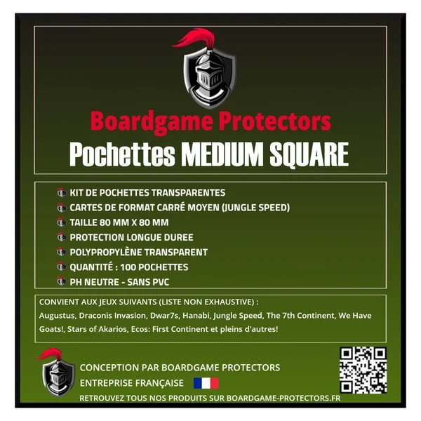Entreprise française, nous utilisons exclusivement les sleeves de haute qualité Boardgame Protectors conçues spécialement pour vous!