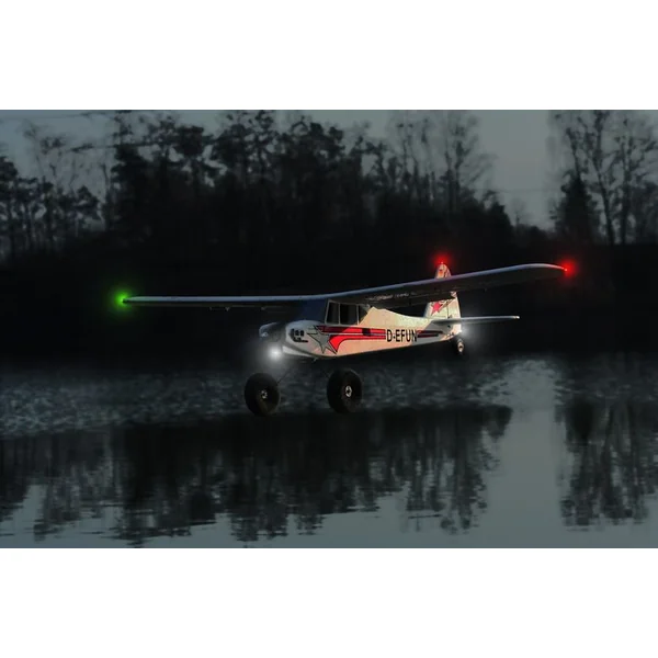pratiquement tous les terrains. Que l‘herbe soit haute ou que le terrain soit défoncé: on sort les volets, on met les gaz, et le voilà en l‘air. De plus, les distances de décollage et d‘atterrissage sont très courtes. A cela, il faut ajouter vos talents de pilote pour une voltige spectaculaire. De grands volets, de grandes roues, une grande hélice et une motorisation avec de la „pêche“, exactement ce qu‘il faut pour cela. En outre, avec le FunCub, vous pouvez remorquer les planeurs de vos collègues modélistes. Pour cela, il suffit d´activer le crochet de remorquage. Equipé de flotteurs, le FunCub se transforme en un merveilleux hydravion. C´est tout simplement un multitalent. Grâce à ses caractéristiques de vol très saines et sa vitesse de décrochage très basse, il est idéal pour apprendre à piloter et en même tempe, le «pro» pourra impressionner ses spectateurs par des figures de voltiges spectaculaires (loopings, tonneaux, vol-dos).