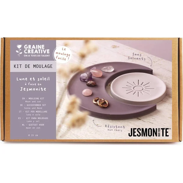 Un set complet pour réaliser 2 coupelles en Jesmonite en forme de lune et soleil dans de délicates teintes de prune.