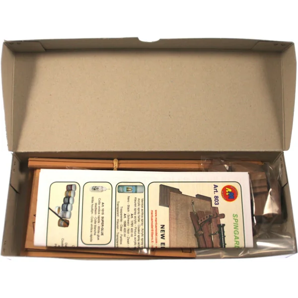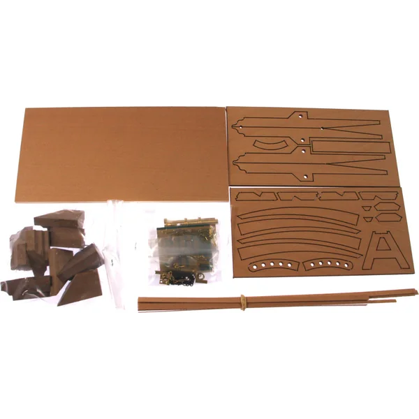 En ouvrant le couvercle de la boîte, vous trouverez des pièces en bois du modèle en contreplaqué, des lattes, de petits composants dans des sachets en plastique et un manuel.