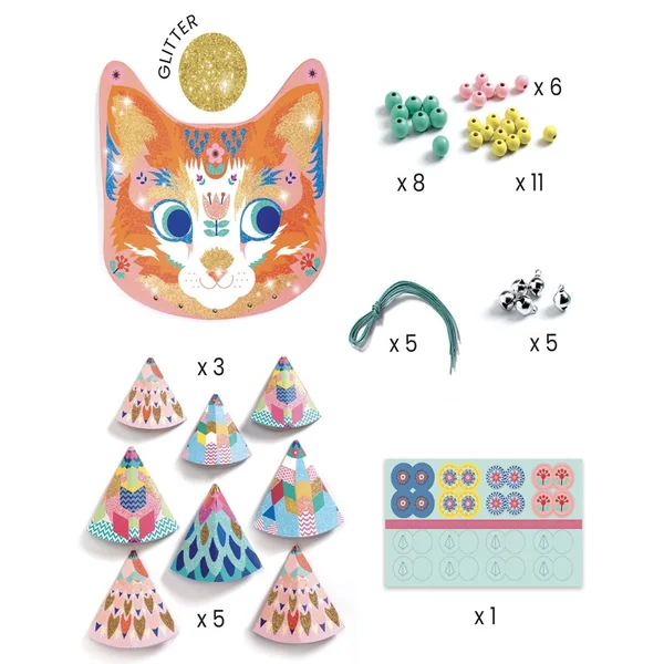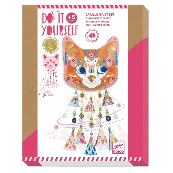 Kitty est un chat carillon à créer : grelots, perles en bois et cônes illustrés sont à enfiler sur les fils de coton cirés qui s’attachent au support fourni. Quand les fils s’agitent, le Kitty scintille de mille feux et tinte agréablement.