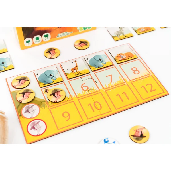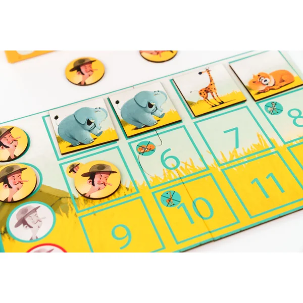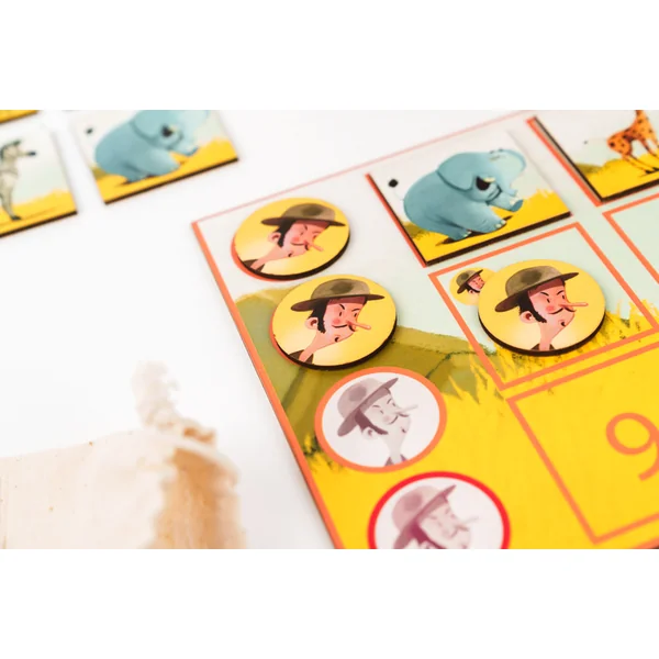 Contenu de la boîte : plateau de jeu réversible (pour une variante facile et difficile), 16 jetons animaux, 16 jetons clés, 8 jetons braconniers, sac en coton.