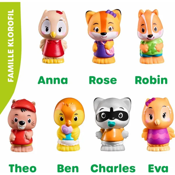 Plein de Klorofil de différentes familles se sont retrouvés au même endroit ! A découvrir : Anna et Eva de la famille Nocty, Rose de la famille Foxy, Theo de la famille Kastor, Robin de la famille Nutnut, Ben de la famille Twitwit et Charles de la famille Raccoon. Idéal pour agrandir sa collection de Klorofil et se raconter toujours plus d’histoires!