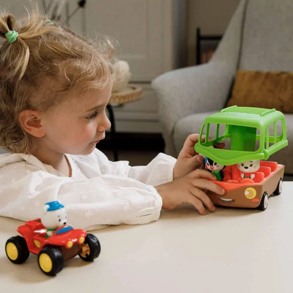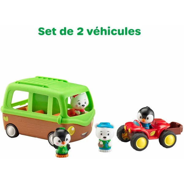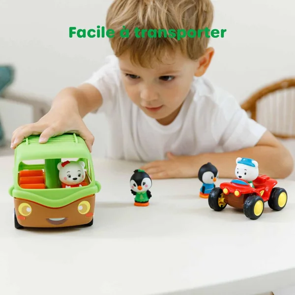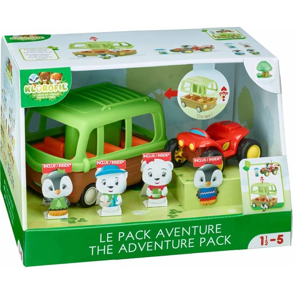 Tut tut ! C’est parti pour l’expédition avec le pack aventure ! Comprend : – Le bus aventure : 6 places à bord du véhicule, ainsi qu’un coffre pour mettre les bagages. Magique, pour monter à bord, il faut appuyer sur le toit … « Pop ! » … pour voir le bus s’ouvrir puis se refermer. Le quad : à découvrir, un coffre pop-up laissant apparaitre une deuxième place, après une simple pression. Il permet aussi de cacher tous ses trésors. 4 personnages exclusifs venant de la banquise.