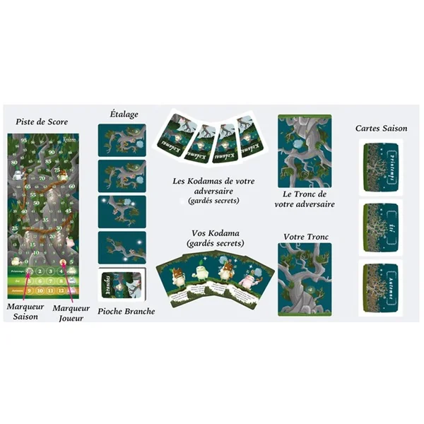 Contenu du jeu : 65 Cartes Branche, 20 Cartes Kodama, 15 Cartes de Saison, 6 Cartes Tronc, 1 Plateau de score, 6 Marqueurs Joueur pour marquer les scores de chacun, 1 Marqueur Saison pour marquer l’avancement du jeu, 1 Pion Premier Joueur, 1 Livret de règles.
