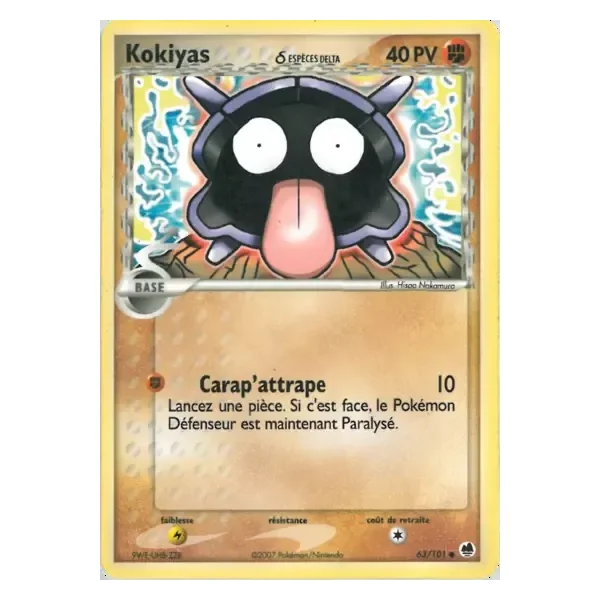 Découvrez Kokiyas δ Espèces Delta (df063), une carte Pokémon de l’extension Île des Dragons, provenant du bloc Ex. Idéale pour compléter votre collection, cette carte Commune plaira autant aux collectionneurs qu’aux joueurs.