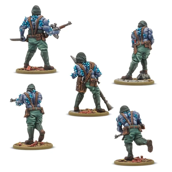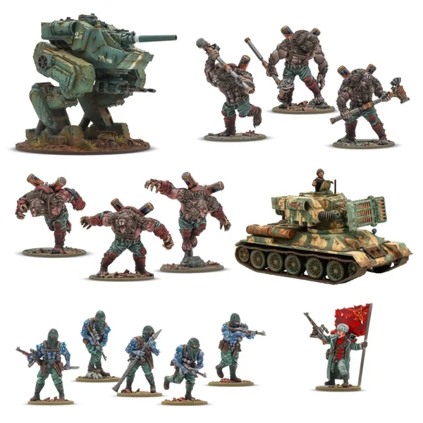 Au centre de la force se trouve un peloton d’assaut composé de deux unités d’infanterie Ursus, énormes, terrifiantes et pratiquement imparables au corps à corps, capables de déchirer la chair et les armures. Ils sont soutenus par une escouade de Moroz Gul, qui refroidissent l’air autour d’eux et libèrent des brumes mortelles qui rendent l’ennemi incapable de riposter. Le peloton est dirigé par un commandant de peloton, brandissant une bannière du Bloc soviétique (cette sculpture est exclusive à ce set).