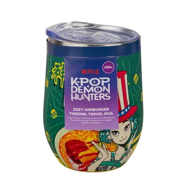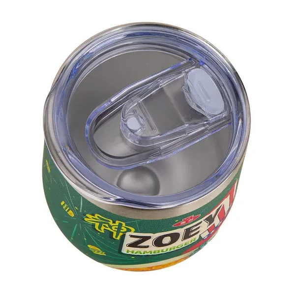 Mug de Voyage Isotherme – Zoey Hamburger matière Body Stainless steel lid plastique. Dimensions 12 x9 x 9 cm.