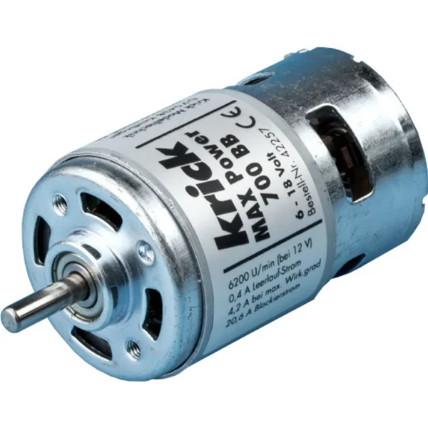 Le moteur Krick MAX Power 700 BB est un moteur électrique universel à courant continu de la série 700 avec un couple élevé, des roulements à billes et un ventilateur interne. Dimensions totales O44 x 98 mm, arbre O 5 mm, tension d’alimentation nominale 12 V, courant jusqu’à 20,6 A, poids 340 g.